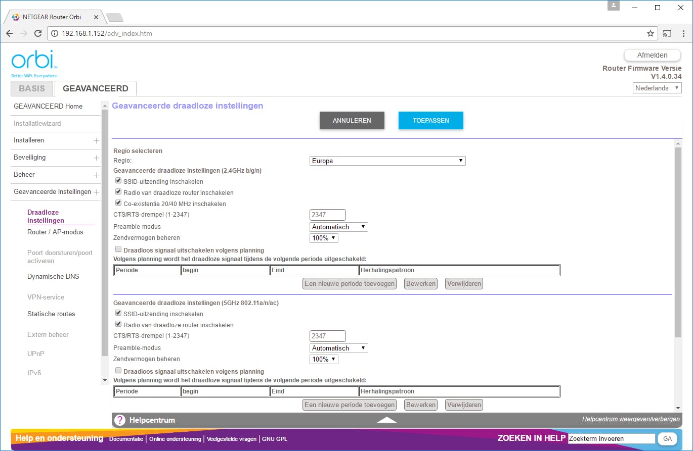 Net als Orbi biedt Velop één ssid voor alle frequentiebanden eventueel aangevuld met een gastnetwerk. Ook is Velop net als Orbi een tri-band systeem met naast een 2,4GHz-radio twee 5GHz-radio’s die in dit geval ieder twee datastromen ondersteunen. Bij bedrade nodes verzorgen alle radio’s een clientnetwerk, maar op de draadloze nodes wordt één 5GHz-radio gereserveerd voor de link met de rest van het systeem. In ons geval werd altijd de radio die actief is op de lagere kanalen (36 t/m 48) gebruikt voor de link, en werd enkel op de radio op de hogere kanalen (vanaf kanaal 100) een clientnetwerk aangeboden. Dat niet altijd handig omdat niet iedere ac-client ondersteuning biedt voor deze dfs-kanalen. Steeds vaker gaat het goed, maar het is jammer als je toevallig een client hebt waarbij het niet werkt. Je hebt hier verder geen invloed op, het systeem bepaalt zelf welke radio voor de link gereserveerd wordt en je kunt niet handmatig een ander kanaal kiezen.