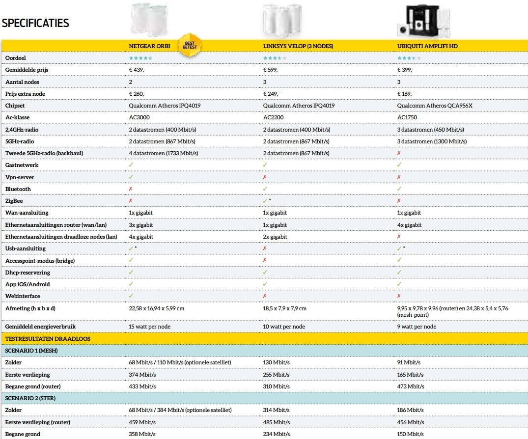 In de Verenigde Staten zijn wifi-mesh-systemen al sinds begin 2016 te koop in de vorm van eero, Luma en Google Wifi. Deze systemen zijn hier niet te koop, maar gelukkig stappen andere netwerkfabrikanten ook in deze markt, met producten die wel in Europa verkrijgbaar zijn. Voor dit artikel hebben we Netgear Orbi, Linksys Velop en Ubiquiti AmfliFi HD met elkaar vergeleken. De systemen worden onder de noemer mesh op de markt gezet. Linksys heeft het bijvoorbeeld over een Whole Home Mesh Wi-Fi System, Ubiquiti over een Mesh Wi-Fi System en Netgear noemt Orbi een Tri-Band Mesh WiFi System.