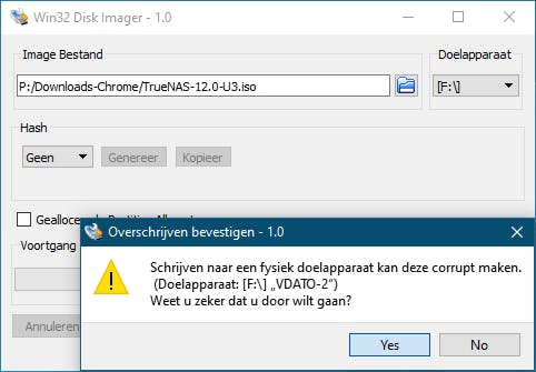 Is de hardware gereed, dan kun je met de software aan de slag. Surf naar www.tiny.cc/trucdl en klik op No Thank you […] en Download Now om het iso-bestand van TrueNAS CORE te downloaden (900 MB). Dit schijfkopiebestand moet je nu omzetten naar een live systeem. Dat kan met een usb-stick en een gratis tool als Win32 Disk Imager. Stop een (lege) usb-stick in je pc en start de tool op. Verwijs via het mapicoon naar je iso-bestand, maar wijzig het uitklapmenu met Disk Images in *.*. Vervolgens selecteer je de stick bij Doelapparaat en hoef je verder alleen nog te bevestigen met Schrijven en Yes.