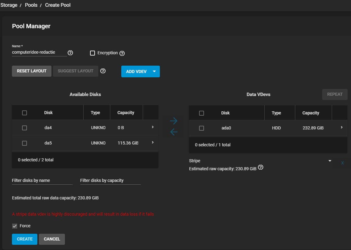 Heb je maar één schijf, dan verschijnt wellicht de melding dat een ‘stripe data vdev’ niet de meest aangewezen oplossing is. Maar het leven gaat verder en dus kies je achtereenvolgens voor Force / Confirm / Continue / Create / Confirm / Create pool. De betreffende media worden nu geformatteerd om je data te kunnen ontvangen.