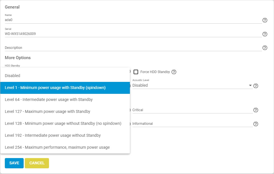 Een eigen machine met TrueNAS heeft alvast één nadeel ten opzichte van een kant-en-klare NAS van bijvoorbeeld QNAP of Synology: het stroomverbruik is doorgaans groter. Wel kun je ervoor zorgen dat je schijven na een tijdje automatisch op stand-by gaan. Open hiervoor Storage en kies Disks. Plaats een vinkje bij de schijf of schijven die je voor je dataopslag gebruikt en klik op Edit disk(s). Wijzig HDD Standy van de standaardwaarde Always On in bijvoorbeeld 30. Dat houdt in dat de schijf na 30 minuten van inactiviteit in stand-by gaat. Eventueel stel je ook Advanced Power Management in op (bijvoorbeeld) Level 1 – Minimum power usage with Standby (spindown) voor een nog zuiniger energiebeleid. Houd er wel rekening mee dat het dan enkele seconden kan duren, voordat de schijf weer helemaal wakker is. Zorg tevens dat er een vinkje staat bij Enable S.M.A.R.T. Bevestig met Save.