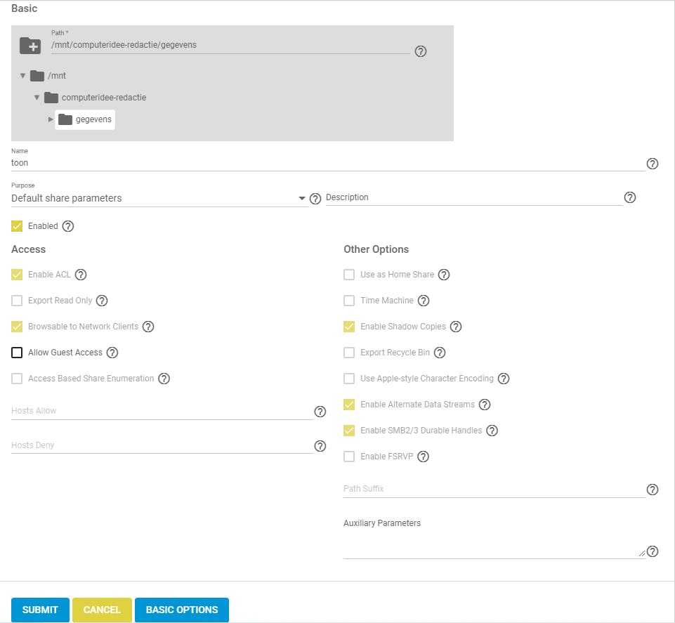 Uit nieuwsgierigheid wil je natuurlijk ook even op Advanced options klikken. Standaard staan daar opties als Enable ACL en Browsable to Network Clients ingeschakeld, en dat wil je zeker zo laten. Wijzig alleen iets aan de andere opties als je goed weet waar ze voor staan. Een klik op het vraagteken geeft je alvast summiere feedback. Bevestig je instellingen met Submit.