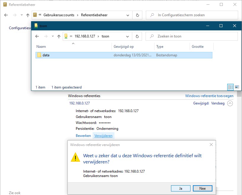 De share voor die gebruiker is nu in principe gebruiksklaar. Tijd dus om dat uit te testen vanaf een Windows-pc in hetzelfde netwerk.