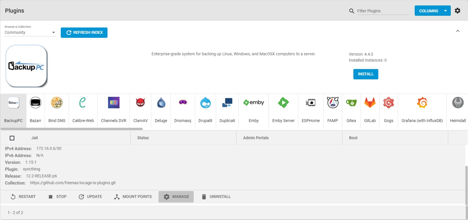 Wel vestigen we graag nog even de aandacht op de rubriek Plugins. De eerste keer moet je aangeven in welke pool je die wilt bewaren (via Choose). Standaard kiest TrueNAS de (eigen) collectie iXsystems voor het plug-inaanbod. Daar zitten al enkele bekende exemplaren tussen, zoals Nextcloud, Plex Media Server en Syncthing. Je kunt ook uit de Community-Collection putten, met meer dan zestig plug-ins, waaronder ClamAV, Drupal8, Duplicati, Emby (Server) en OpenVPN Server.