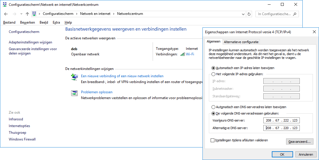 Voor Windows 10 stel je als volgt een andere dns in. Geef in je startmenu de zoekopdracht Netwerkcentrum en open het gelijknamige onderdeel. Klik op je netwerkverbinding (onder toegangstype) en kies Eigenschappen. Klik op Internetprotocol versie 4 en kies Eigenschappen. Activeer De volgende DNS-serveradressen gebruiken en stel aangepaste dns-serveradressen in.