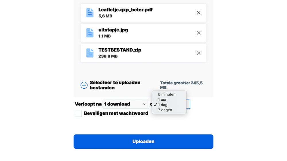 Ook het uploaden van bestanden is kinderlijk eenvoudig. Je kunt de blauwe knop gebruiken om naar de bestanden te navigeren, of je sleept deze bestanden simpelweg in het verzendvak van de webpagina. Hier lees je ook de totale grootte van het pakket dat je wilt delen. Bovendien geef je aan wanneer deze bestanden van de server zullen verdwijnen.