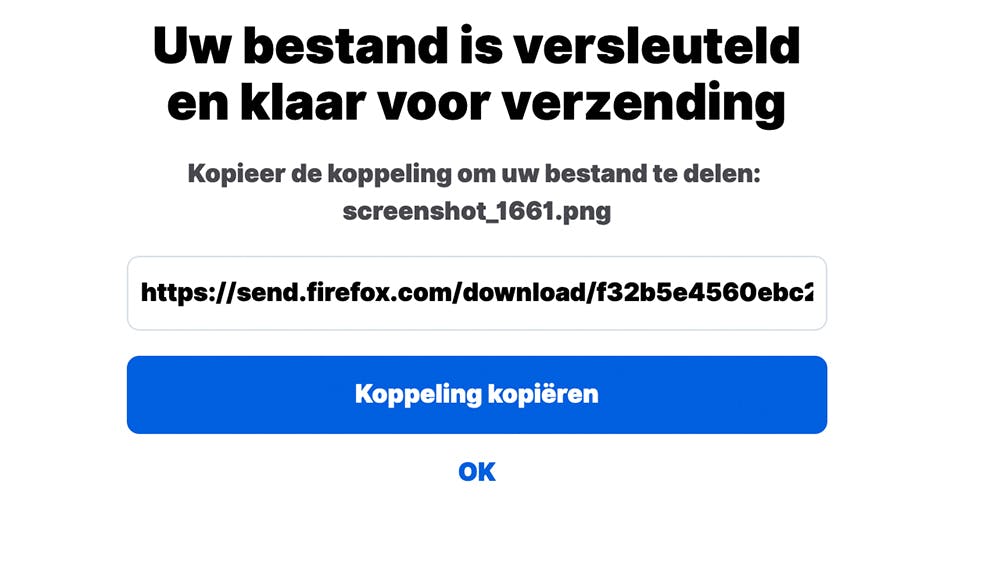 Voor de beveiliging doet Firefox Send een beroep op de Web Crypto API. Dit genereert een sleutel, codeert het bestand en plaatst vervolgens de sleutel in de url die je met de ontvanger deelt.