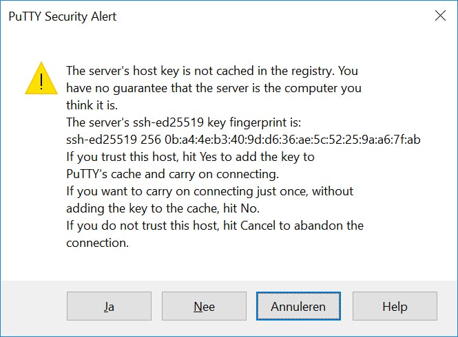 Omdat het de eerste keer is dat je op de Pi inlogt via ssh, krijg je een gevaarlijk ogende waarschuwing (“PuTTY Security Alert”). Dat doet PuTTY omdat het de host key (een unieke beveiligingssleutel) van je Pi nog niet kent. Klik op Ja om de host key in PuTTY op te slaan, zodat je de volgende keren deze waarschuwing niet meer krijgt.
