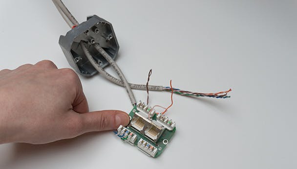1. Voer de kabels door in je wandcontactdoos of patchpanel. Wij hebben voor deze foto de wandcontactdoos op tafel gelegd, normaal monteer je dit aan de kabel die uit je muur komt.