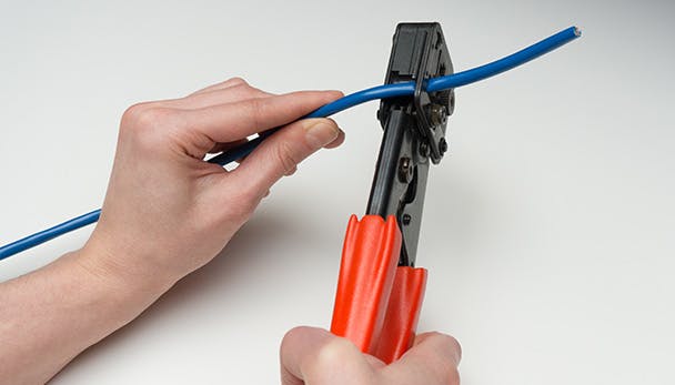 1. Knip de kabel op lengte met de ingebouwde schaar in de krimptang of een normale schaar. Schuif eventueel alvast een knikbeschermer om de kabel als je dat wilt.