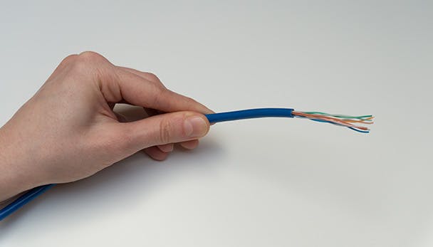 Met de keuze voor een snelheidscategorie ben je er niet, want er zijn kabels met vaste (solid) en soepele (stranded) kern te koop. Netwerkkabels met een vaste kern bevatten aders die uit één koperdraad bestaat, terwijl bij een kabel met soepele kern een ader uit meerdere heel dunne koperdraadjes bestaat. Een netwerkkabel met vaste kern is daardoor minder soepel dan een netwerkkabel met soepele kern. Je gebruikt een netwerkkabel met vaste kern op vast geïnstalleerde verbindingen in je netwerk, bijvoorbeeld in de muur, terwijl je kabels met soepele kern op flexibele plekken in je netwerk gebruikt (bijvoorbeeld tussen een wandcontactdoos en pc). Dit is vergelijkbaar met elektriciteitsbedrading. In je huis zijn in de muren elektriciteitskabels met een vaste kern geïnstalleerd, terwijl de netsnoeren van apparatuur en verlengdozen elektriciteitskabels met een soepele kern bevatten.