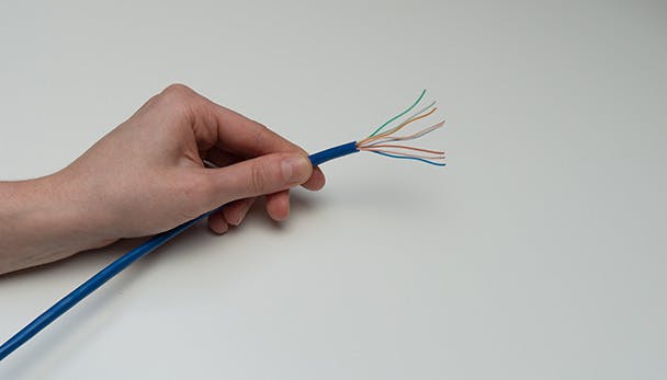 Je begint het maken van een patchkabel met het op lengte knippen van de kabel waarbij je hem zo'n 6 centimeter langer maakt dan uiteindelijk de bedoeling is. Als je de stekker wilt voorzien van een knikbeschermer, schuif die er dan alvast op. Verwijder zo'n drie centimeter van de isolatie met een kabelstripper of voorzichtig met een mesje. Vervolgens ontvlecht je de acht aders tot het punt waarop je de isolatie hebt weggehaald. Leg de acht aders in de juiste volgorde. Deze volgorde staat bekend als T568B en vind je verderop. Knip de aders af zodat ze ongeveer één centimeter lang zijn. Schuif de aders nu in de RJ45-stekker zover als mogelijk. Er moet dan ook een stukje van de buitenste mantel in de stekker verdwijnen voor de trekontlasting.