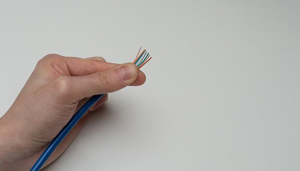2. Strip de buitenste mantel met een kabelstripper of een ander mesje (pas op dat je de aders niet beschadigt) tot circa drie centimeter.