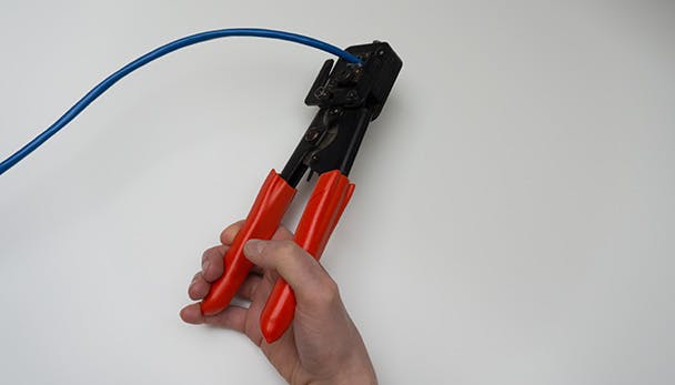 Stop de RJ45-plug nu in de krimptang en knijp de tang dicht. De stekker zal nu vastklikken op de kabel en de acht aders zullen doorboord worden door de tandjes in de RJ45-stekker. Herhaal dit aan de andere kant van de kabel en de patchkabel is af.
