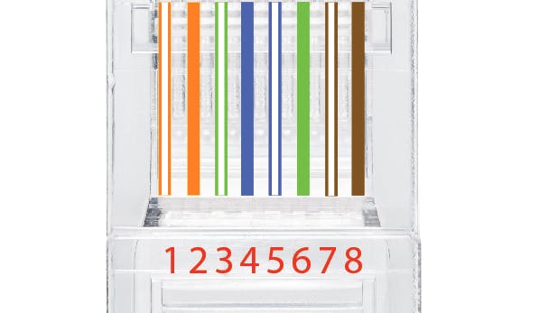 Houd bij het maken van een netwerkkabel de T568B-aansluitvolgorde aan. De lip moet naar onder staan. Ook LSA-stroken moet je in deze volgorde aansluiten. Meestal is er een kleurcodering voor B, anders moet je de juiste kleur op het juiste cijfer aansluiten.