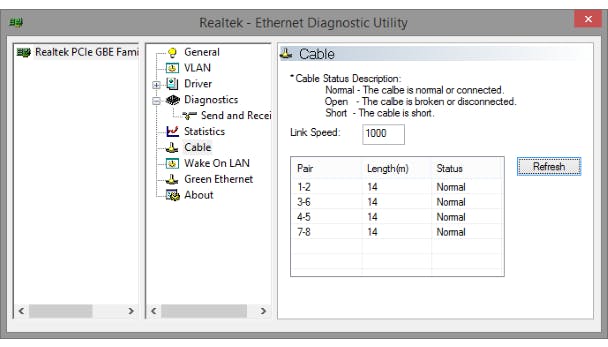 Fabrikanten van netwerkkaarten (zoals hier Realtek) bieden tooltjes om de kabel te testen.