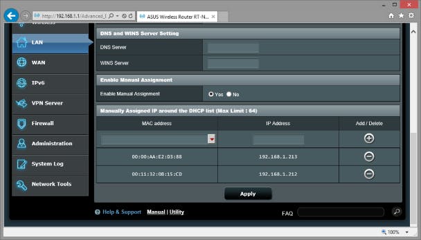 Helaas geeft DHCP geen zekerheid dat een apparaat altijd hetzelfde IP-adres krijgt toegewezen. Voor netwerkapparaten die een dienst aanbieden, zoals NAS-apparaten, netwerkprinters en beveiligingscamera's is het wel handig als er altijd hetzelfde IP-adres wordt gebruikt. Op veel routers kun je vaste IP-adressen via DHCP toekennen. Hiervoor wordt het MAC-adres van het netwerkapparaat opgegeven in de router in combinatie met het IP-adres dat je wilt toewijzen. Het MAC-adres (Media Access Control) is een unieke tekenreeks waarmee een netwerkapparaat geïdentificeerd kan worden. De optie om DHCP-reserveringen te doen, wordt door iedere routerfabrikant anders genoemd. De ASUS-router die we thuis gebruiken, spreekt over 'Manually Assigned IP around the DHCP list', terwijl andere fabrikanten het over bijvoorbeeld DHCP Reservations, DHCP-reserveringen of Static Lease hebben.