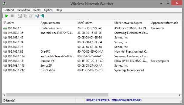 Wil je gegevens hebben over de apparatuur die is aangesloten op je netwerk dat is Wireless Network Watcher een handig programma. Hiermee zie je van ieder apparaat het IP-adres, MAC-adres, de fabrikant en de apparaatnaam. Handig als je iets moet instellen én om te weten te komen of er onbedoelde gebruikers toegang hebben tot je netwerk.