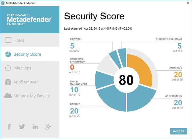 De veiligheid van de systemen in je netwerk is ongetwijfeld één van je grootste aandachtspunten. Uiteraard heb je overal een antivirustool draaien (zie ook verder voor een gratis gecentraliseerde oplossing), maar je wilt bijvoorbeeld ook (op elk moment kunnen) weten hoe het op die systemen met de status van de firewall zit, of Windows Update wel actief is, of de back-up nog wel draait, of er geen publieke bestandsdeling actief is, en of de antiphishingbeveiliging op de browsers wel is ingeschakeld. Dit alles en net iets meer maakt de tool Opswat Metadefender Endpoint je duidelijk vanuit één centrale beheermodule in de cloud.
