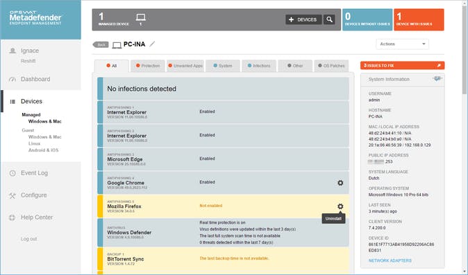 De applicatie uitrollen naar je andere pc's en die aan je cloudportal koppelen kan echter ook makkelijker. Meld je aan bij je portal en klik bij Metadefender Endpoint Management op Login. Vervolgens klik je op +Devices en klik je op één van beide links: op deze manier krijg je een aangepaste installatie van de tool die de computer automatisch aan je portal koppelt. Open je in deze portal de rubriek Devices, dan krijg je een overzicht van alle aangekoppelde systemen. Klik op zo'n systeem om (veel) meer details te zien over de veiligheidsstatus, vergelijkbaar met wat je via de lokale client te zien krijgt.