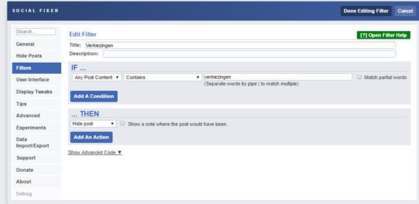 Om politieke content (of welke andere content dan ook) op Facebook te kunnen verbergen, heb je de add-on social fixer nodig. Surf naar de pagina van deze add-on in de Google Chrome Store en klik op Toevoegen aan Chrome. Je hoeft de browser niet opnieuw te starten, de add-on is direct geïnstalleerd. Wanneer je nu rechtsboven klikt op het pictogram voor Social Fixer, kun je de instellingen aanpassen. In het tabblad Filterklik je op Add a Filter. Vervolgens voeg je de voorwaarden toe. Stel dat je niets wilt zien over verkiezingen, dan vul je het trefwoord verkiezingen in naast Any Post Content Contains. Onder het kopje Then vul je vervolgens in dat de post verborgen moet worden. Je kunt hier uiteraard alle trefwoorden invullen die je kunt bedenken, maar pas op dat je niet te breed invult en straks dingen mist die je niet wilt zien.