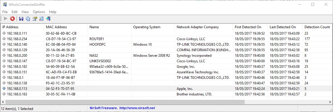 Bij het opstarten van WhoIsConnectedSniffer laat je desgevraagd de optie WinPcap Packet Capture Driver aangevinkt. Als het goed is toont de tool vervolgens de gedetecteerde toestellen, zoals een netwerkprinter, pc’s, internetcamera, router, nas, enzovoort. Je komt onder meer de ip- en mac-adressen te weten, evenals de naam van de fabrikant.