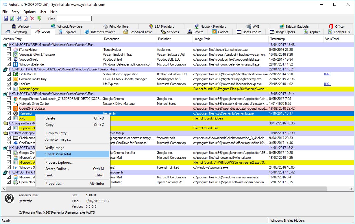 Ook nuttig: wanneer je een item aanklikt met de rechtermuisknop en Check VirusTotal selecteert, wordt het naar een online antivirusservice doorgestuurd en krijg je even later in de kolom Virus Total (uiterst rechts) het resultaat te zien van een zestigtal antivirustools.
