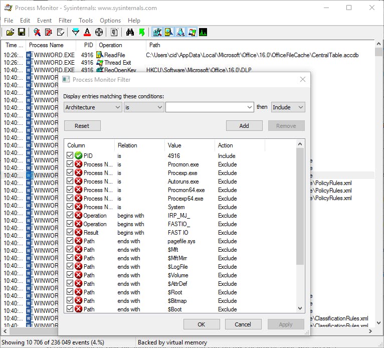 Wil je haarfijn kunnen instellen wat de tool moet monitoren dan maak je beter gebruik van het filterknopje. Via de uitklapmenu’s kun je hier meerdere filters activeren en bijvoorbeeld alleen bepaalde toepassingen laten monitoren die specifieke handelingen uitvoeren. Met de Reset-knop verwijder je deze extra filters weer.