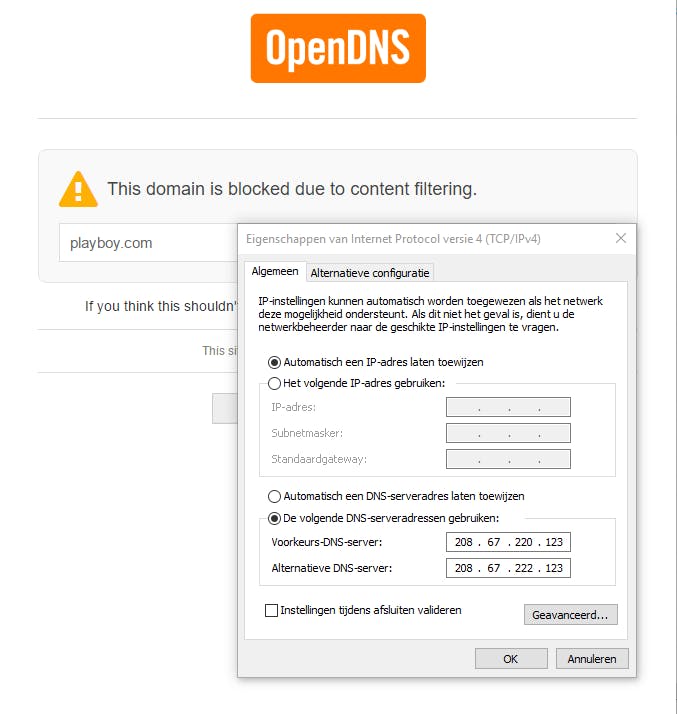 Stel je op een bepaald moment vast dat je niet meer kunt surfen, controleer dan of er wel een ip-adres staat ingevuld bij DNS Servers. Overigens kun je ook altijd zelf alternatieve dns-servers invullen, bijvoorbeeld die van Google. Dat doe je als volgt in Windows. Druk op Windows-toets+R en voer het commando ncpa.cpl uit. Klik de (actieve) netwerkadapter met de rechtermuisknop aan en kies Eigenschappen. Kies Internet Protocol Versie 4 en druk op de knop Eigenschappen. Vink De volgende DNS-serveradressen gebruiken aan en vul de adressen 8.8.8.8 en 8.8.4.4 in. Of, voor wie dat nuttig vindt: wanneer je hier 208.67.220.123 en 208.67.222.123 invult dan worden de meeste pornografische sites op dit toestel automatisch geblokkeerd – met dank aan de dns-servers van OpenDNS.