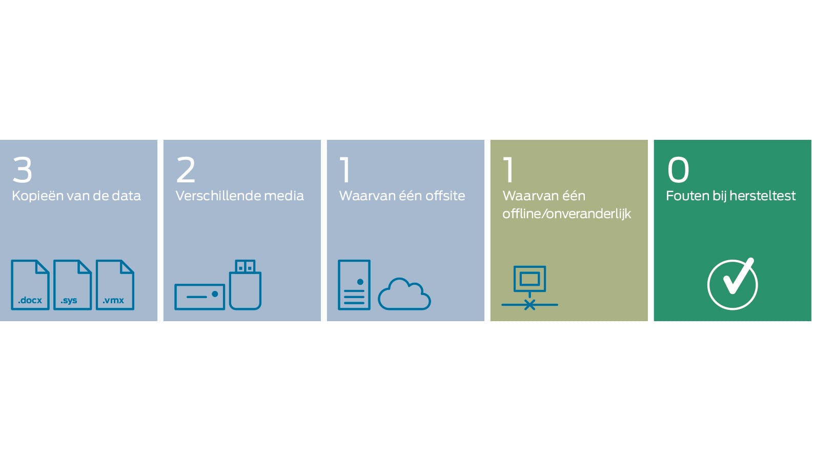 De afgelopen jaren is de hoeveelheid digitale gegevens die ieder van ons heeft en gebruikt flink toegenomen. Maar niet alleen de hoeveelheid is veranderd, ook het belang van die gegevens. Waren het eerst vooral digitale kopieën van analoge documenten en foto's, inmiddels is de digitale versie veelal de enige versie. Daarom is de regel voor een goede back-up ook aangepast. Stelde die eerder dat je minimaal 3 kopieën van de data moet hebben, die je op 2 verschillende media bewaart waarvan 1 op een andere locatie wordt opgeslagen (de 3-2-1-regel). Vanwege de dreiging en vernietigende impact van ransomware zijn daar 1 kopie op onveranderlijke opslag én zeker weten dat de back-up zich met 0 fouten laat herstellen aan toegevoegd. Kortom: 3-2-1-1-0. Niet elk aspect hiervan is even gemakkelijk te realiseren. Onveranderlijke opslag is lastig, evenals opslag buiten het eigen huis. Althans, tot de komst van cloud. Want door een kopie van de gegevens juist daar op te slaan, is de veilige opslag buiten het eigen huis voor iedereen haalbaar. Daar is bovendien de beveiliging op hoog niveau, inclusief versiebeheer, wat dit een acceptabel alternatief maakt voor het wegschrijven op een onveranderlijk medium. Wel zijn zowel de snelheid van de back-up als het herstel afhankelijk van de snelheid van de internetverbinding. Bij herstel gaat het doorgaans wel om individuele bestanden waardoor dat nadeel minder zwaar weegt.