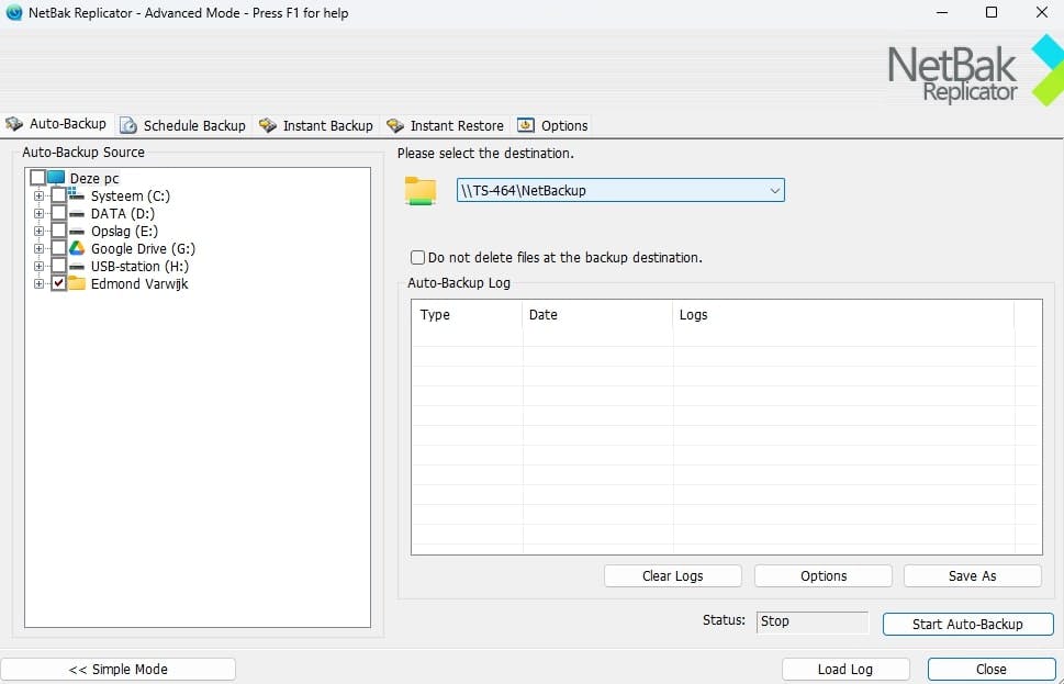 Voor een back-up van bestanden en mappen naar een NAS is er NetBak Replicator. De Engelstalige software laat zich eenvoudig installeren en komt dan met een wizard om het doel van de back-up en de te back-uppen mappen en bestanden te kiezen. Het kent een Simple en een Advanced modus en een optie om na afronden van de back-up de computer uit te schakelen. Automatisch inschakelen om een back-up te maken ontbreekt, evenals versies voor Mac of Linux. Voor de Mac adviseert QNAP gebruik van Apple Time Machine en de bijbehorende service op de NAS te activeren. Dit werkt prima, maar is natuurlijk geen QNAP-oplossing en wijkt dan ook geheel af van de werking van NetBak Replicator.