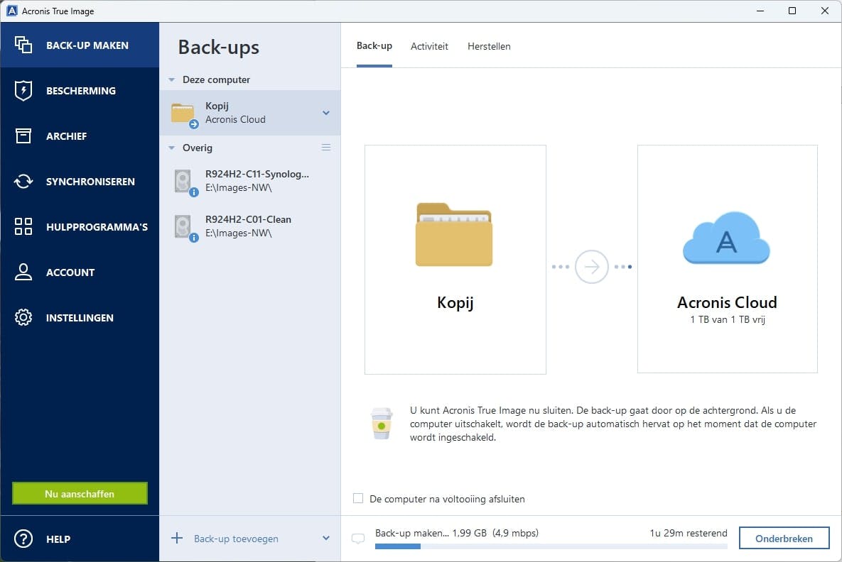 Wil je je gegevens veiligstellen zonder NAS of ingewikkelde NAS-software, dan biedt Acronis True Image een gebruiksvriendelijk alternatief. Deze combinatie van antimalware en back-upsoftware maakt offline images van schijven of volledige systemen, zodat je bij problemen kunt terugkeren naar een veilig moment. De desktopversie (voor Windows en Mac) maakt volgens een eigen schema automatische, volledige of incrementele back-ups. Die kunnen worden opgeslagen op een andere schijf, pc, NAS of in de Acronis-cloud, die fysiek in Duitsland staat en onder Europese privacywetgeving valt. De cloudopslag is afhankelijk van de gekozen versie en uitbreidbaar tot 5 TB. Back-ups zijn eenvoudig te beheren via de software of webbrowser.