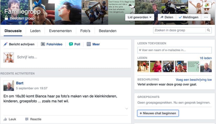 Heb je net een feestje achter de rug en wil je enkele foto’s delen met de aanwezigen? Ook daar is een besloten groep ideaal voor. Je tikt bovenaan in de balk van het tekstvak op Foto/video en vervolgens kies je Foto-/videoalbum maken. Vervolgens selecteer je alle foto’s die je wilt uploaden. Je kunt het album een titel geven, er een locatie aan toevoegen, de volgorde van de foto’s aanpassen, leden taggen en bijschriften per foto toevoegen. Ook videofragmenten kun je in het album plaatsen. Zodra je klaar bent, klik je op Plaatsen.