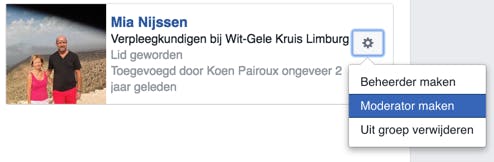 Zodra je een Facebook-groep aanmaakt, ben jij de beheerder en alle mensen die je uitnodigt zijn leden. In grote groepen kan de taak van een beheerder echter een beetje uit de hand lopen. Dan is het een goede zaak om bepaalde enthousiaste leden ook aan te stellen als beheerder. Dat doe je als volgt: ga naar het Leden-tabblad en klik op het tandwieltje naast een persoon. Je hebt de keuze uit Beheerder maken en Moderator maken. Beide rollen kunnen een lidmaatschapsverzoek goedkeuren of afwijzen, berichten in een groep goedkeuren of afwijzen, berichten en reacties op berichten verwijderen, mensen uit een groep verwijderen en een bericht vast- of losmaken. Een beheerder heeft echter nog iets meer voorrechten dan een moderator. Hij of zij kan ook een ander lid de rol van beheerder of moderator toekennen of verwijderen en de groepsinstellingen (zoals de naam, de omslagfoto en de privacy-instellingen) aanpassen.
