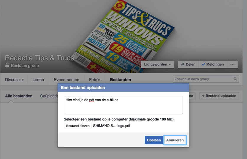 Een erg interessante functie van Facebook-groepen is de mogelijkheid om allerlei bestanden, bijvoorbeeld pdf’s, tekstbestanden of spreadsheets, te delen met je groepsleden. Hoe je dat doet? Je klikt op het tabblad Bestanden en vervolgens kies je Bestand uploaden. Vervolgens navigeer je op je harde schijf naar de juiste bestandslocatie en selecteer je het bestand. Let wel, nagenoeg alle bestandstypes zijn toegestaan, maar het bestand mag niet groter zijn dan 100 MB. Ga verder met Open. Desgewenst kun je nog een korte omschrijving toevoegen. Klik op Opslaan om het uploaden te starten. Het bestand komt vervolgens onder Geüploade bestanden te staan en verschijnt ook als bericht. Alle leden kunnen het bestand Downloaden of een Voorbeeld opvragen. Het is ook mogelijk om een nieuw tekstbestand aan te maken vanuit je Facebook-groep. Hiervoor klik je op Document maken. Je start met een titel en daarna kun je een intro, bodytekst en tussenkopjes toevoegen. De opmaakmogelijkheden zijn ietwat beperkt, maar je kunt wel opsommingstekens of een quote toevoegen. Zodra je klaar bent, klik je op Publiceren. Andere groepsleden kunnen het bestand nu openen én aanpassen, gelukkig slaat Facebook de bewerkingsgeschiedenis op.