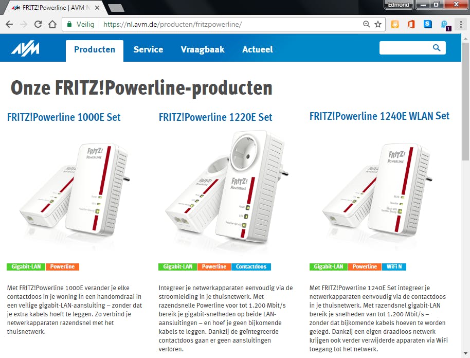 Helaas is het niet altijd praktisch om een netwerkkabel te trekken naar alle plekken waar het wifi-netwerk niet voldoet. Voor deze plekken moet je een alternatieve techniek gebruiken. De bekendste is powerline. Powerline is een techniek die de elektriciteitsbekabeling tussen de stopcontacten in huis gebruikt om een netwerkverbinding te maken. Anders dan bij een router of switch, heb je bij powerline altijd twee adapters nodig. De eerste verbind je met de router en steek je daarna in het stopcontact. De tweede steek je in het stopcontact op de plek waar je een beter netwerk nodig hebt. Op die laatste sluit je dan een apparaat of wifi-accesspoint aan. Je kunt het powerline-netwerk uitbreiden met extra adapters en zo overal in huis waar een stopcontact zit eenvoudig een snelle netwerkverbinding maken.