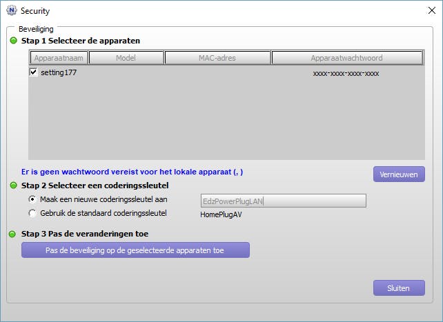 De enige stap die je nadat de verbinding is gemaakt nog kunt uitvoeren, is het beveiligen van de verbinding. HomePlug AV biedt de mogelijkheid al het netwerkverkeer te versleutelen. Daarmee voorkom je dat iemand door alleen een extra adapter in een stopcontact te steken, al het netwerkverkeer kan afluisteren. De meeste powerline-adapters bieden een knop om de beveiliging te activeren. Die knop moet dan op elk apparaat binnen een bepaalde tijd van elkaar ingedrukt worden. Steeds meer merken leveren ook software met de adapters mee waarin je de adapter kunt configureren en waarin je ook de beveiliging kunt instellen. Dit is altijd pas mogelijk nadat de adapters op de hiervoor beschreven manier in de stopcontacten zijn aangesloten. Zorg ervoor dat je de beveiliging pas inschakelt wanneer het powerline-netwerk goed werkt en alle adapters in het netwerk zijn opgenomen. Te vroeg op de beveiligingsknop drukken zorgt er juist voor dat die adapter voor de andere onbereikbaar wordt. Een reset naar de fabrieksinstellingen is dan nodig om de adapter weer te kunnen laten communiceren met de andere adapters.