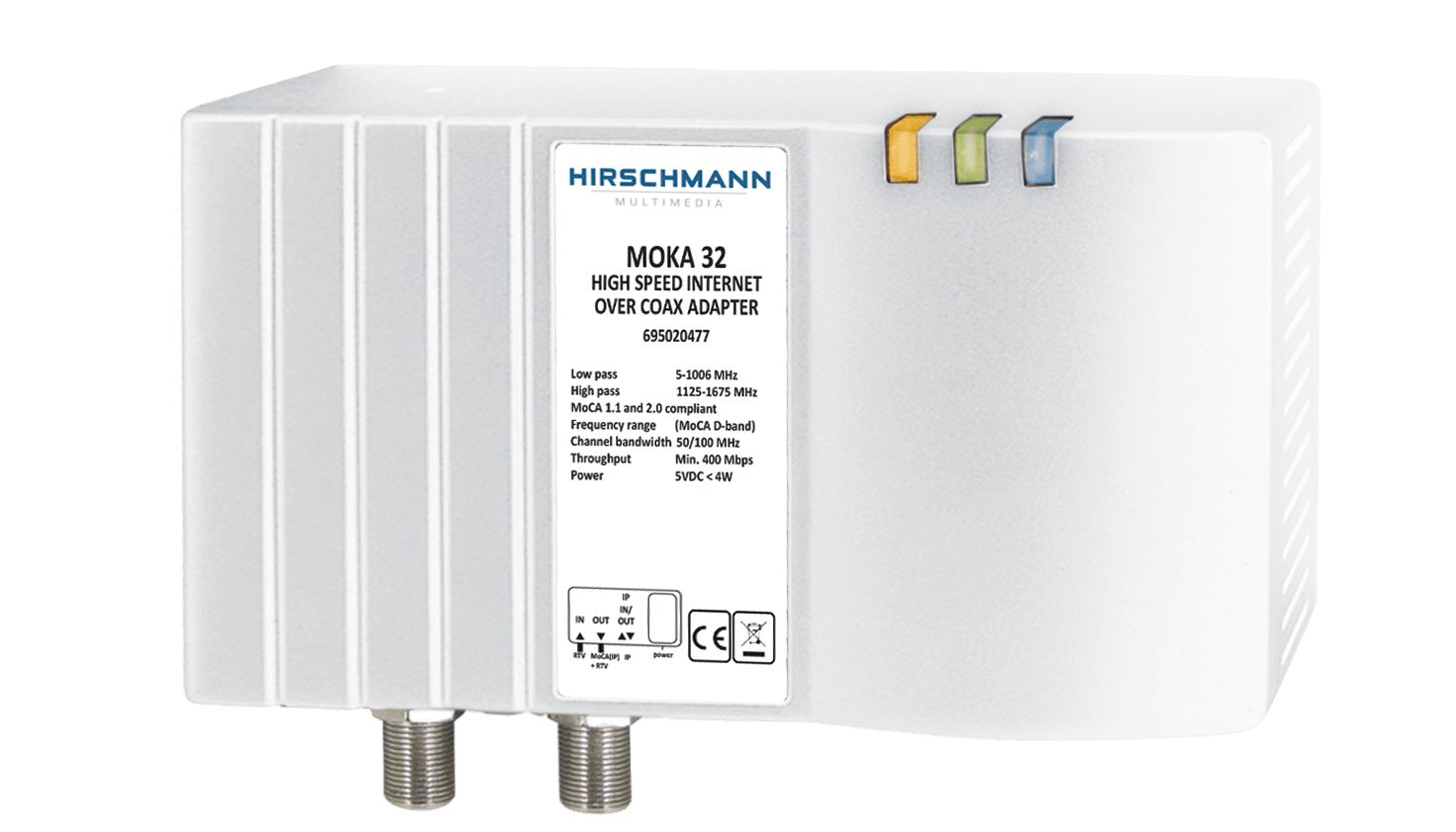 MoCA is een techniek die veel lijkt op powerline, alleen gebruikt MoCA niet het stroomnet maar een al in huis aanwezige televisiekabel. Net als bij powerline heb je ook bij MoCA minimaal twee adapters nodig. De eerste plaats je liefst dicht bij de router. Op elke adapter zit een coaxingang, coaxuitgang en een netwerkaansluiting waarmee je de adapter met de router verbindt. Nadat je de adapter volgens het meegeleverde schema hebt aangesloten, herhaal je deze stappen op de plek waar je het netwerksignaal wilt gebruiken maar nu verbind je de netwerkaansluiting niet met de router maar met het apparaat dat daar staat. Na een paar minuten zullen de leds op de adapters aangeven dat de verbinding is gemaakt en kun je behalve televisiekijken ook internetten via de coax-kabel. De nieuwste Moka32-adapters van Hirschmann beloven een snelheid van 400 Mbit/sec, die je in de praktijk ook echt haalt. Het is bij Hirschmanns adapters niet mogelijk het MoCA-signaal te versleutelen. Volgens de leverancier blijft het signaal echter altijd binnen het eigen huis.