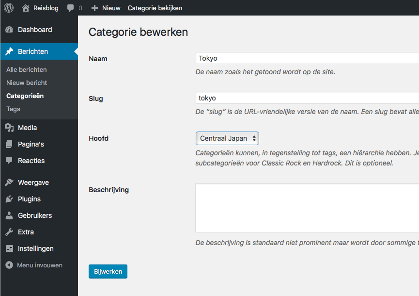 Als je veel berichten gaat aanmaken, is het handig om deze in verschillende categorieën onder te verdelen. Niet alleen profiteer je hier later van bij de zoekmachines, ook een eventuele zoekfunctie op je site is hierbij gebaat. Als je een reisblog hebt, kun je bijvoorbeeld per continent, land of stad een categorie aanmaken. Bij een fotografieblog zou je kunnen kiezen voor categorieën als analoog, digitaal en spiegelreflex. Je maakt een categorie aan door op Berichten / Categorieën te klikken. Onder Nieuwe categorie toevoegen geef je een naam in onder Naam. Onder Slug geef je een url-vriendelijke versie aan zonder spaties of leestekens. Wil je subcategorieën instellen, dan kun je onder Hoofd instellen welke categorie de hoofdcategorie van de aan te maken categorie wordt. Bij een reisblog zou je bijvoorbeeld als hoofdcategorie Europa kunnen aanmaken en als subcategorie België. Je moet altijd eerst een hoofdcategorie aanmaken, anders kun je bij een subcategorie deze hoofdcategorie niet selecteren. Onder Beschrijving mag je iets invullen, maar het is ook prima om dit leeg te laten. Standaard heeft WordPress een categorie Geen categorie aangemaakt. Ga er met je muis overheen en klik op Bewerken om deze categorie te wijzigen in een nieuwe categorie.