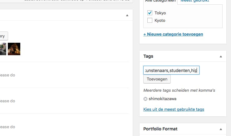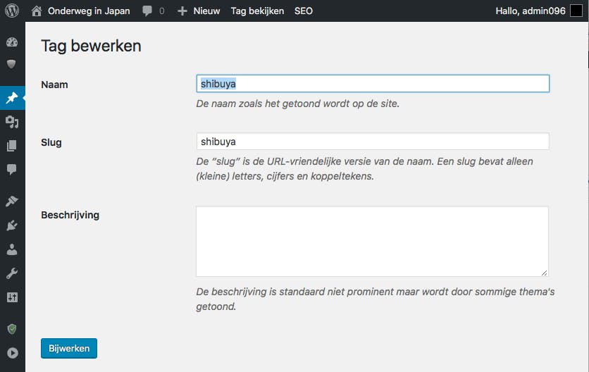 Ga naar een bericht, aan de rechterkant vind je de het kopje Categorieën. Hier selecteer je een zojuist aangemaakte categorie door er een vinkje voor te zetten. Wil je een nieuwe categorie toevoegen, klik dan op Nieuwe categorie toevoegen. Onder Tags vind je een veld waar je tags kunt intypen. Typ een woord in en klik op Toevoegen, de tag verschijnt dan onder het veld. Je kunt een tag weer verwijderen door op het kruisje te klikken. Wil je meerdere tags tegelijkertijd toevoegen, dan scheid je ze met een komma. Druk op de Enter-toets en alle tags worden meteen onder het veld weergegeven. Vergeet na het toevoegen van categorieën en tags niet om op Bijwerken te klikken.