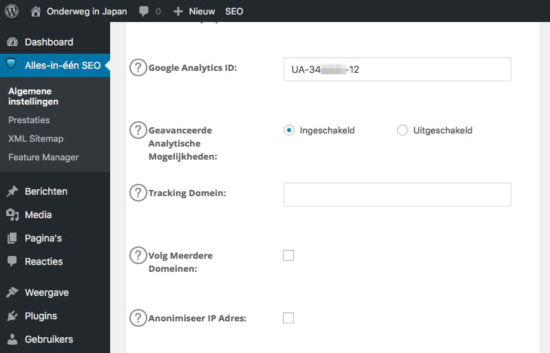 Onder Websitenaam geef je een naam aan en onder Website-URL geef je het webadres aan. Geef eventueel een branchecategorie aan en zet de tijdzone op Nederland. Sluit af door op Tracking-ID ophalen te klikken. Op de volgende pagina zie je je tracking-ID, een code van twee letters en acht cijfers. Met de Alles-in-één SEO-plug-in hoef je zelf geen php-code aan je site toe te voegen. Je kopieert gewoon de tracking ID die je in je Google Analytics-account vindt en plakt hem bij Alles-in-één SEO / Algemene instellingen / Google Instellingen / Google Analytics ID. Eronder kun je vervolgens veel meer opties instellen. Klik op het vraagteken voor elke functie om te weten te komen wat het precies doet. Vergeet niet om onderaan op Update instellingen te klikken.