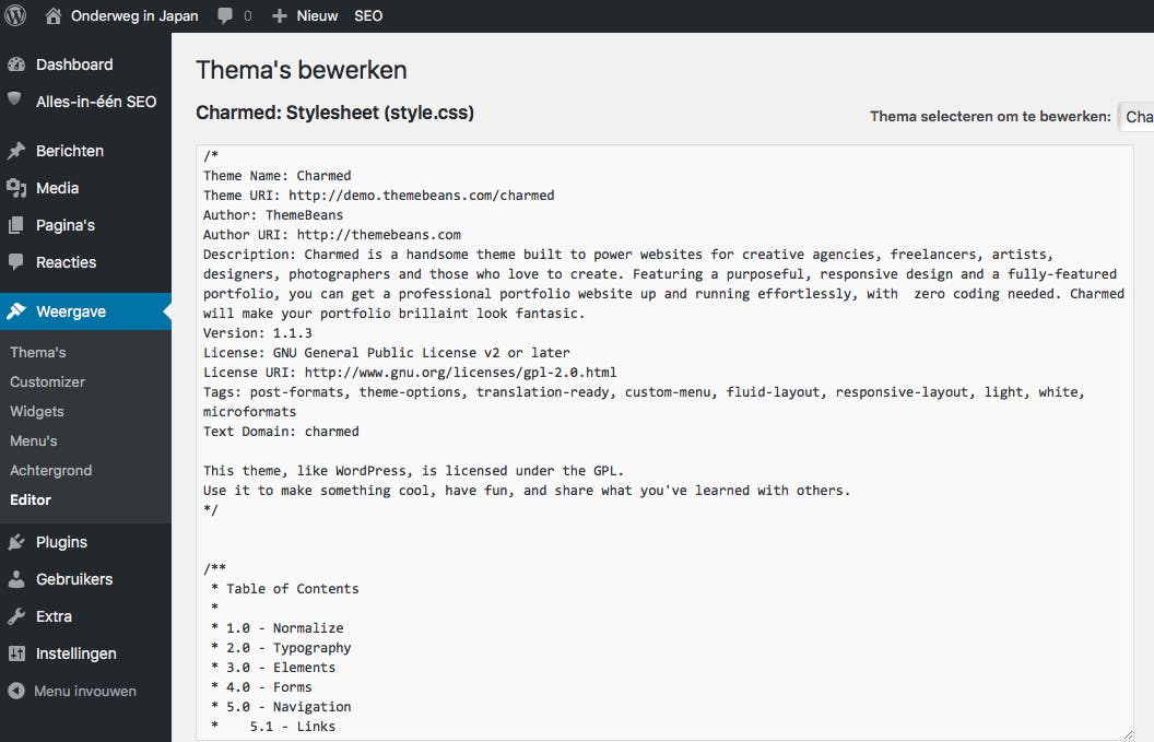 Als je meer weergaveopties van je thema wilt wijzigen en je thuis bent in de programmeertaal css, dan kun je naar Weergave / Editor gaan en rechts onderaan het bestand Stylesheet (style.css) selecteren. Om te weten welk deel van je website welke css-regel gebruikt, selecteer je in Firefox via het contextmenu de optie Element inspecteren (in Chrome heet de optie Inspecteren). Pas wel op met het veranderen van informatie in de editor. Als je niet weet wat je doet, kun je gemakkelijk je site kapot maken. Je kunt hier ook alle php-bestanden wijzigen. Hier moet je echt alleen aankomen als je weet wat je doet. Als je één komma verkeerd zet, kan je site onbereikbaar zijn, dit oplossen kan een heel karwei zijn.