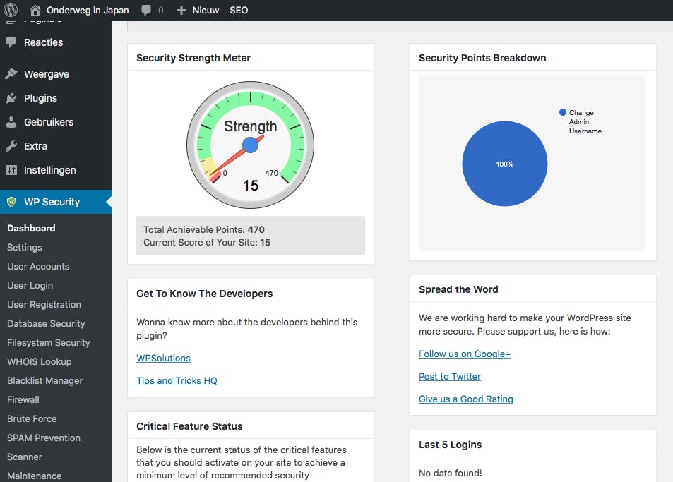 Het bijhouden van WordPress-updates is al een stap in de goede richting naar een veilige website, maar als je je website echt goed tegen aanvallen of indringers wilt beschermen, is het handig om een plug-in te installeren. De plug-in All In One WP Security & Firewall is een goede optie. Installeer en activeer de plug-in en ga naar WP Security / Dashboard. Je ziet aan de meter hoeveel veiligheidsmaatregelen je al hebt genomen en hoeveel je er nog moet doen. Op deze pagina kun je al wat instellingen doorvoeren, maar alle functies staan ook in submenu’s duidelijk uitgelegd. Zet bijvoorbeeld bij Firewall een vinkje achter Enable Basic Firewall Protection om de firewall aan te zetten. Om een brute force-aanval te voorkomen, kun je de locatie van je loginpagina wijzigen bij WP Security / Brute Force. Op deze manier maak je het ongenode gasten lastiger om je pagina aan te vallen. Lees wel even de instructies door, want het wijzigen van je login-locatie kan gevolgen hebben voor de functionaliteit van je website.