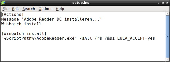 Sla het bestand daarna op. We houden het nu nog simpel: bovenaan definieer je altijd het blok actions met daarin de secundaire acties die je uit wilt voeren. In dit geval voeren we maar één actie uit, namelijk het stilletjes installeren van Adobe. Winbatch is een losse, bekende scriptingtaal en voert dat commando uit met de Windows-api. %ScriptPath% is een globale variabele van Opsi die de huidige locatie aangeeft en daarin staat de Reader-installatie. We geven dan een aantal switches mee om de software stil mee te installeren.
