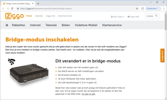 Ziggo legt voor sommige routers uit hoe je de bridge-modus activeert.