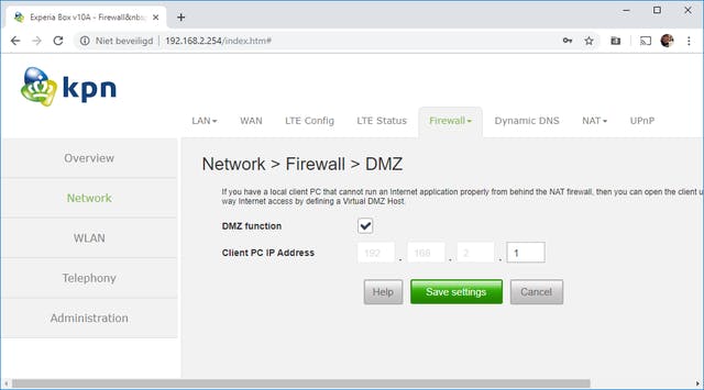 Indien je modem/router geen bridgemodus heeft, dan is er gelukkig nog een oplossing om bijna hetzelfde te bereiken. Je kunt namelijk de DMZ-modus gebruiken. Een DMZ, voluit een demilitarized zone, is daar waar alles is toegelaten. In een bedrijf is dat een compleet apart netwerk. Bij een thuisnetwerk betekent een DMZ dat de router dan alle poorten voor een specifiek apparaat openzet. Door het IP-adres van jouw eigen (nieuwe) router in te vullen, zal de originele router van je internetprovider geen poorten meer blokkeren.