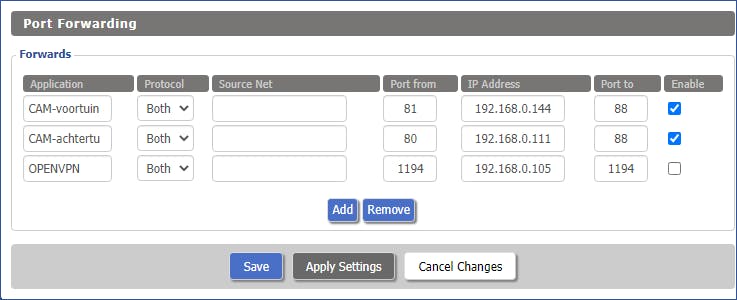 In een opstelling zoals beschreven in de paragraaf ‘Twee routers (lan-wan)’ zul je merken dat de toestellen van het binnenste netwerk niet zomaar meer vanaf het buitenste netwerk bereikbaar zijn. Dit opzet schermt het binnenste netwerk wel beter af voor externe malversaties, maar toestellen of services in dit netwerk worden ook moeilijker bereikbaar via portforwarding.