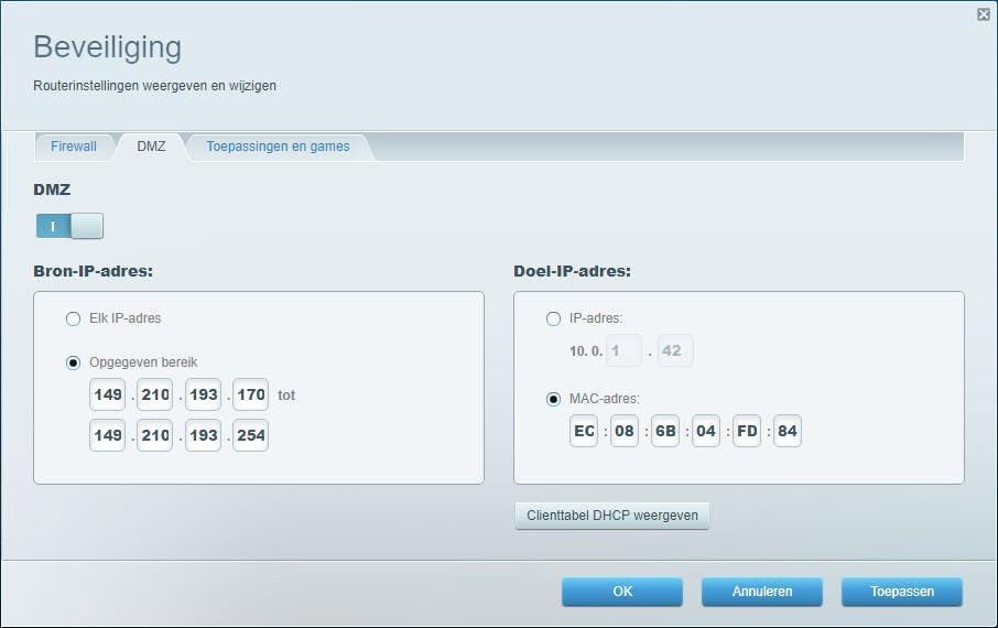 Je kunt het ook over een andere boeg gooien en bijvoorbeeld een toestel met services die je publiek toegankelijk wilt maken in de DMZ (‘demilitarized zone’) van je router onderbrengen. Alle externe aanvragen worden dan naar de poort doorgestuurd die je in de DMZ hebt ingevuld, behalve de pakketjes voor de poorten die je eventueel al voor portforwarding had ingesteld.