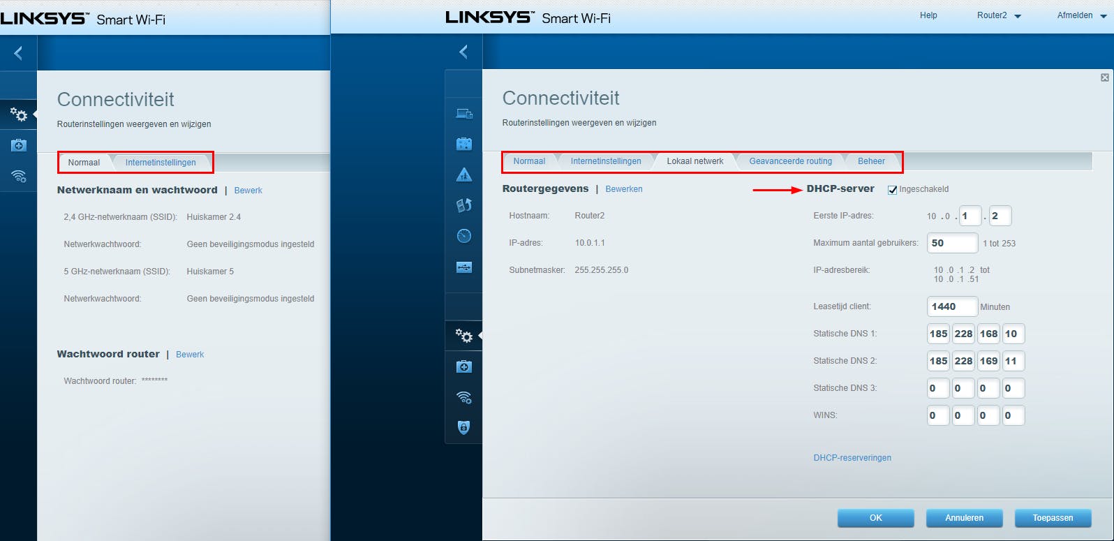 Je mag nu de tweede router via de lan-poort verbinden met de rest van je netwerk. Je kunt nu je tweede router ook als draadloos toegangspunt laten fungeren, bijvoorbeeld met een verschillende SSID voor elk van de beschikbare frequentiebanden. Je stelt op beide routers bij voorkeur wel dezelfde wifi- en encryptiestandaard en hetzelfde wachtwoord in. Voor de 2,4GHz-band kun je het best uiteenlopende kanalen gebruiken, zoals 1 en 11.