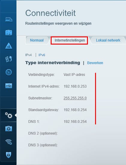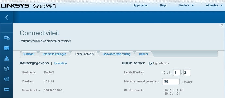 Herstart vervolgens je pc, zodat die een ip-adres krijgt via de DHCP-service van de tweede router en open de webinterface van deze router. Geef die een vast ip-adres mee binnen het subnet van je eerste router, maar bij voorkeur wel buiten het DHCP-bereik. Op je tweede router vul je voor de standaard-gateway en de DNS-server telkens het interne ip-adres van je eerste router in. Sla de wijzigingen op en herstart de tweede router, waarna je hier de DHCP-service en eventueel ook de firewall uitschakelt.